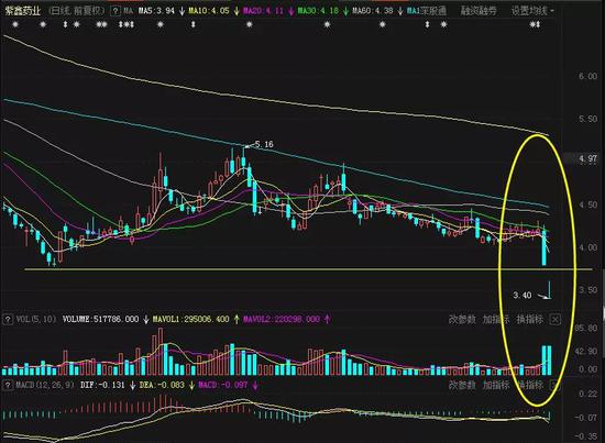 今日的紫鑫药业这个跌停看上去似乎没有什么特别之处,但是从日K线图上来看,可就麻烦大了!