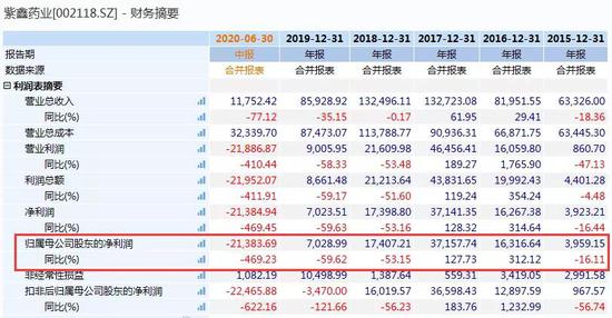 同时Wind数据显示,紫鑫药业的归母净利润自2018年以来以每年同比50%以上的速度下滑,2019年归母净利润仅7000万元。到了今年上半年,归母净利润巨亏2亿多元,同比下滑幅度高达469%。