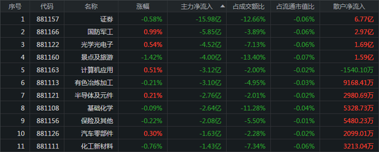 主力资金流出的板块分别是证券、军工、光电,主力资金流出金额分别为15.98亿元、5.85亿元、4.52亿元,其中散户净流入金额为6.77亿元、2.97亿元、1.69亿元。
