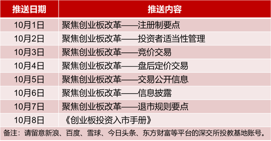 今年的系列活动将持续开展一个月,主题是“聚焦创业板注册制 践行理性价值投资”,将围绕创业板改革并试点注册制平稳落地,向投资者讲解制度规则,引导投资者进行理性投资,保障创业板注册制高质量运行。在国庆中秋假日期间,深交所将通过“深交所投教基地”账号推送“聚焦创业板改革”系列视频及《创业板投资入市手册》;后续将推出《新经济云看台》视频、《创业板改革ABC》音频和投资者公益广告等投教产品;此外,将联合地方证监局、行业协会举办“投教大讲堂”“走进上市公司”等线下投教活动。