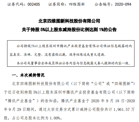四维图新9月30日午间公告称,公司于近日收到持股5%以上股东腾讯产业投资基金的告知函,其于2020年9月18日-2020年9月29日期间,通过大宗交易方式累计减持公司股份共计1961.57万股,占公司总股本比例为1%。
