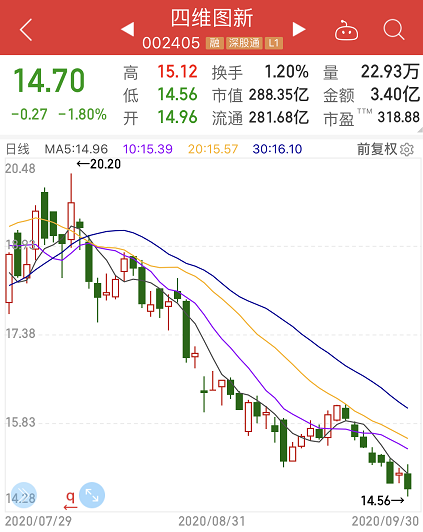 受此影响,四维图新午后股价持续走低,盘中跌幅一度接近3%,截至收盘,股价下跌1.8%,报收14.7元。距离7月份的22.58元的股价高点,跌幅接近35%。