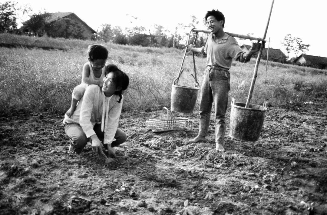 1987年,湖南常德市桃源县八字路乡侯家河村田间劳作的三口之家。" 视觉中国 供图