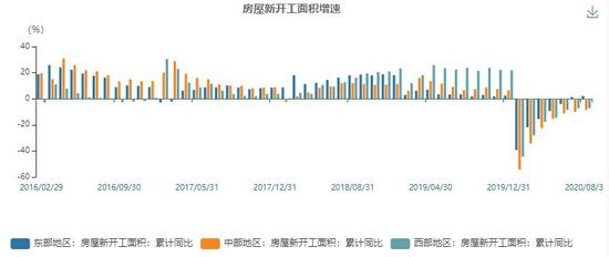其中,东部地区的新屋开工面积累计值为62,785.29万平方米,同比增速为2.1%,增速处在历史较低水平;