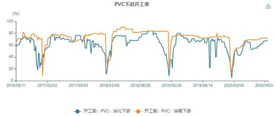 截止至2020年09月18日,聚氯乙烯上游厂商开工率为80%,处在历史平均水平。聚氯乙烯下游华北地区厂商开工率为68.5%,下游华南地区厂商开工率为72%,处在历史较高水平。