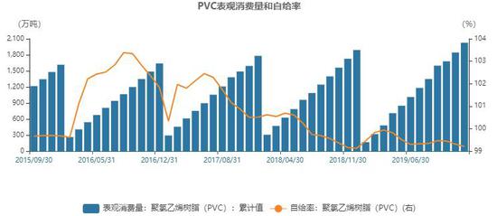 截止至2019年12月,当年PVC表观消费量累计值为2,026.76万吨,处于历史较高水平;PVC产量累计值为2,010.7万吨,处于历史较高水平;