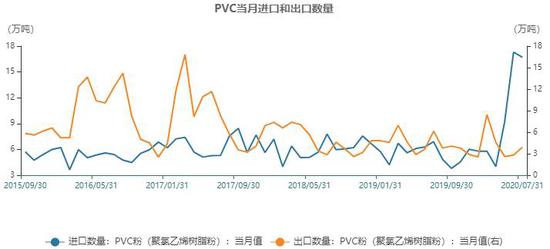 PVC进口量当月值为5.8万吨,处于历史较低水平;PVC出口量当月值为2.55万吨,处于历史较低水平;当月PVC的自给率为99.21%,处于历史较低水平。