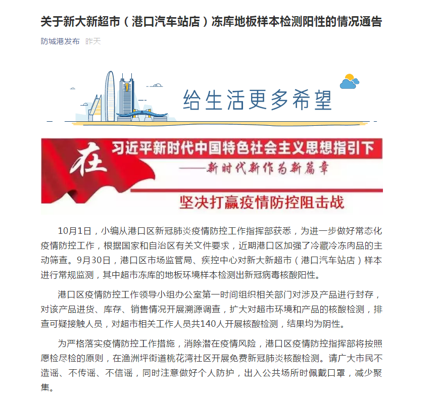 防城港发布微信公号消息,10月1日晚,广西防城港港口区新冠肺炎疫情防控工作指挥部通报,9月30日,港口区市场监管局、疾控中心对新大新超市(港口汽车站店)样本进行常规监测,其中超市冻库的地板环境样本检测出新冠病毒核酸阳性。