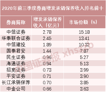 Wind数据显示,前三季度共有55家券商在IPO承销保荐业务上累计入账174.25亿元,较上年同期大幅增长150%以上,其中中信建投、中信证券、中金公司占据前三位,海通证券、国金证券收入排名出现大幅提升。前三季度券商增发承销保荐收入亦随着市场定增热情升温而水涨船高。