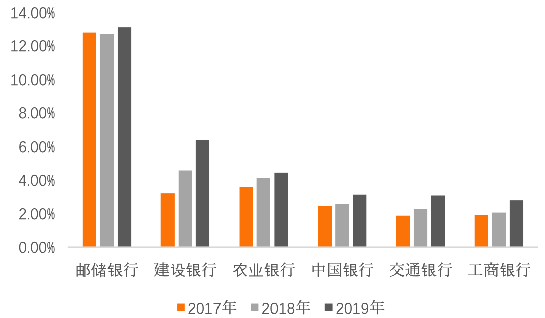 图3:2017-2019年6大商业银行普惠型小微企业贷款余额占总贷款余额的比例
