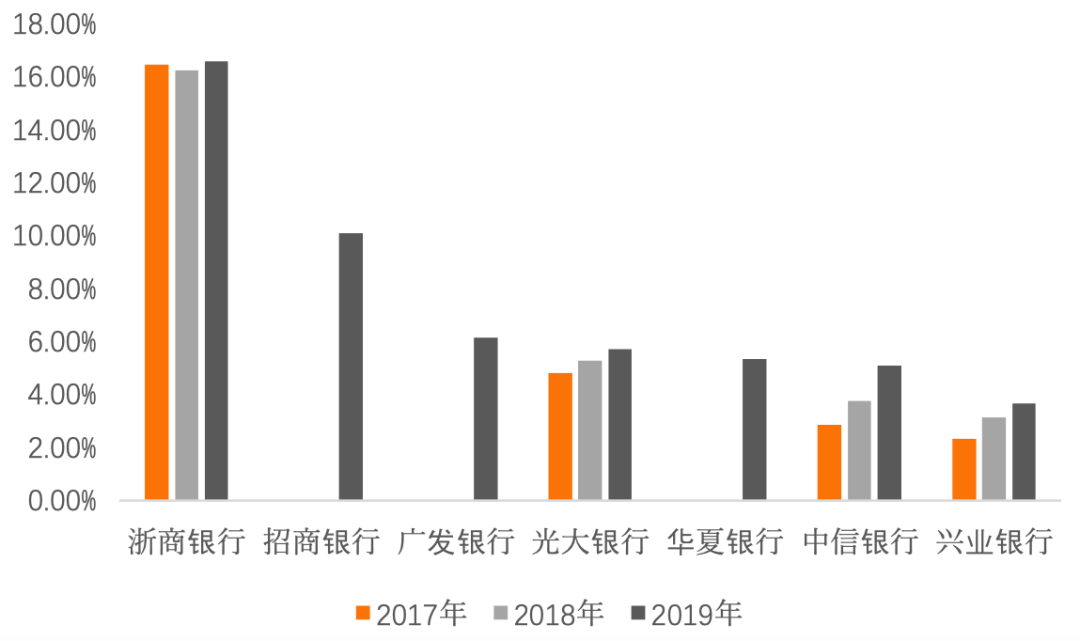 值得关注的是,2019年浙商银行的这一比例达16.61%,在7家银行中居于首位,在全国性银行中也仍居于首位。招商银行的这一比例为10.09%,位居第二;广发银行和光大银行则分别为6.14%和5.37%,居于第三、第四。