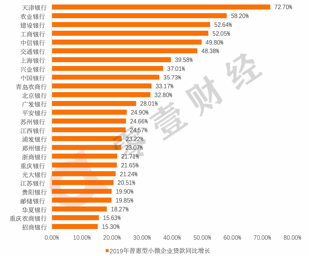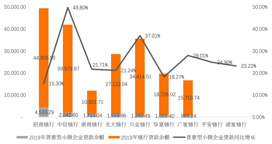 在同比增速方面,中信银行、兴业银行、广发银行、平安银行、浦发银行、浙商银行、光大银行同比增长超20%。其中,中信银行增幅近50%,年报显示,中信银行依托金融科技手段研发小微信贷自动审批和智能风控预警系统,普惠型小微企业贷款不良率低于全行不良平均水平。2019年,普惠金融贷款高出各项贷款增速约40个百分点,大幅超出银保监会“两增两控”和央行定向降准最高档考核要求。
