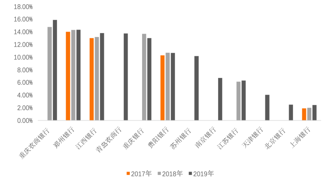 在占比方面,2017-2019年,重庆农商行、郑州银行及江西银行在占比上持续保持相对较高比例。2019年12家上市城、农商行普惠型小微贷款余额占银行贷款余额的平均比例为9.48%。重庆农商行、郑州银行、江西银行、青岛农商行、重庆银行、贵阳银行和苏州银行都超出平均比例。贵阳银行的占比与2018年基本持平。