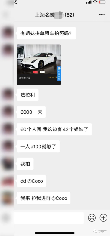 《上海名媛群》中还提到,群内还会发起法拉利日租拼团。根据文章中发布的微信群聊天记录截图显示,一台法拉利F12跑车的日租价格为6000元,一位群成员准备邀请60名成员拼团。