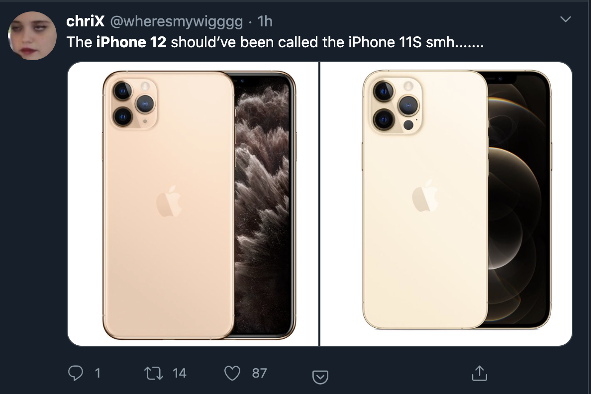 此次iPhone12在外观和配置上,都与iPhone 11区别不大。虽然增加了5G功能,却没有像其他友商一样把屏幕刷新率提高到120Hz,电池续航没有改善,“齐刘海”也没有缩小,让手机的外观看上去也很类似。对此有网友吐槽称,iPhone 12应该叫iPhone 11S。
