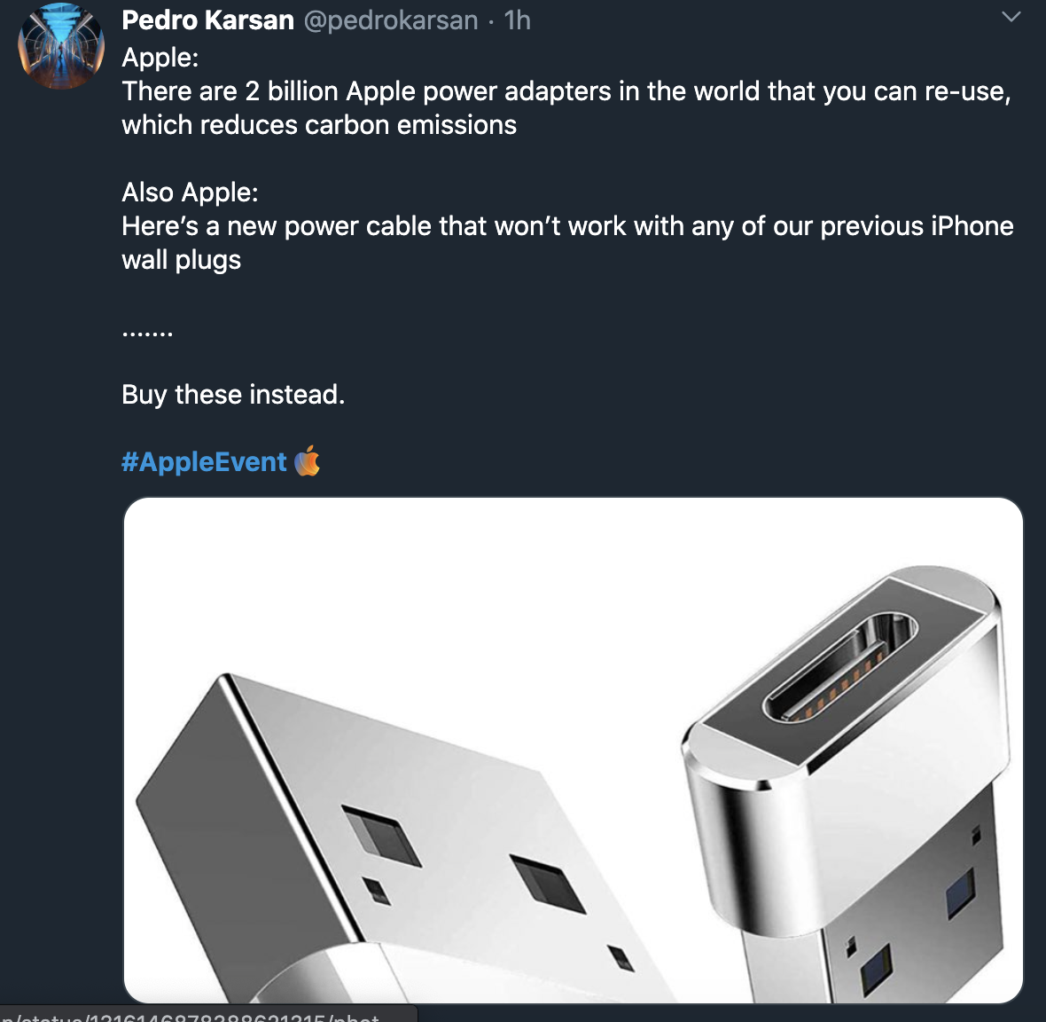 苹果:世界上有20亿苹果充电器,你可以重复使用,减少碳排放;还是苹果:这个新充电线和此前我们所有iPhone使用的墙上插头都不兼容……买这些替代吧。