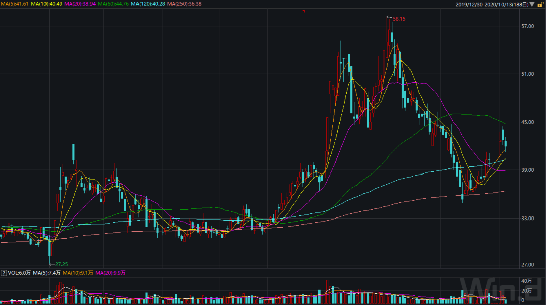 截至2020年10月14日收盘,博雅生物报收于40.29元/股,较近期高点已回落28%。