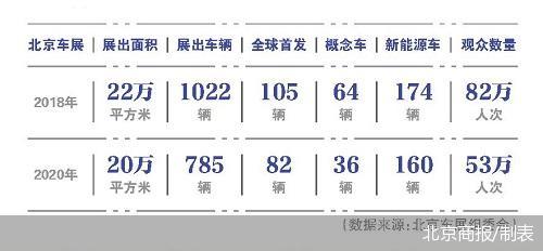 北京车展组委会发布数据显示,本届北京车展总展出面积达20万平方米,共展示车辆785辆、全球首发车82辆、概念车36辆、新能源车160辆。展会期间,中国国际展览中心(天竺)新馆和中国国际展览中心(静安庄)两个展区共吸引观众53万人次。相比于2018年22万平方米的展出面积、1022辆展示车辆以及82万人次的参观人数,本届北京车展规模有所“缩水”,不过作为疫情下首个A级车展仍然“成色十足”。