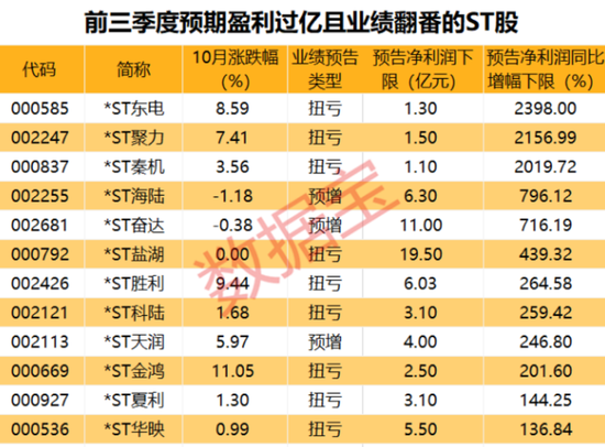 证券时报•数据宝统计显示,截止10月15日,共有107只ST股公布了三季报业绩预告,其中,10股业绩预增,36股扭亏。