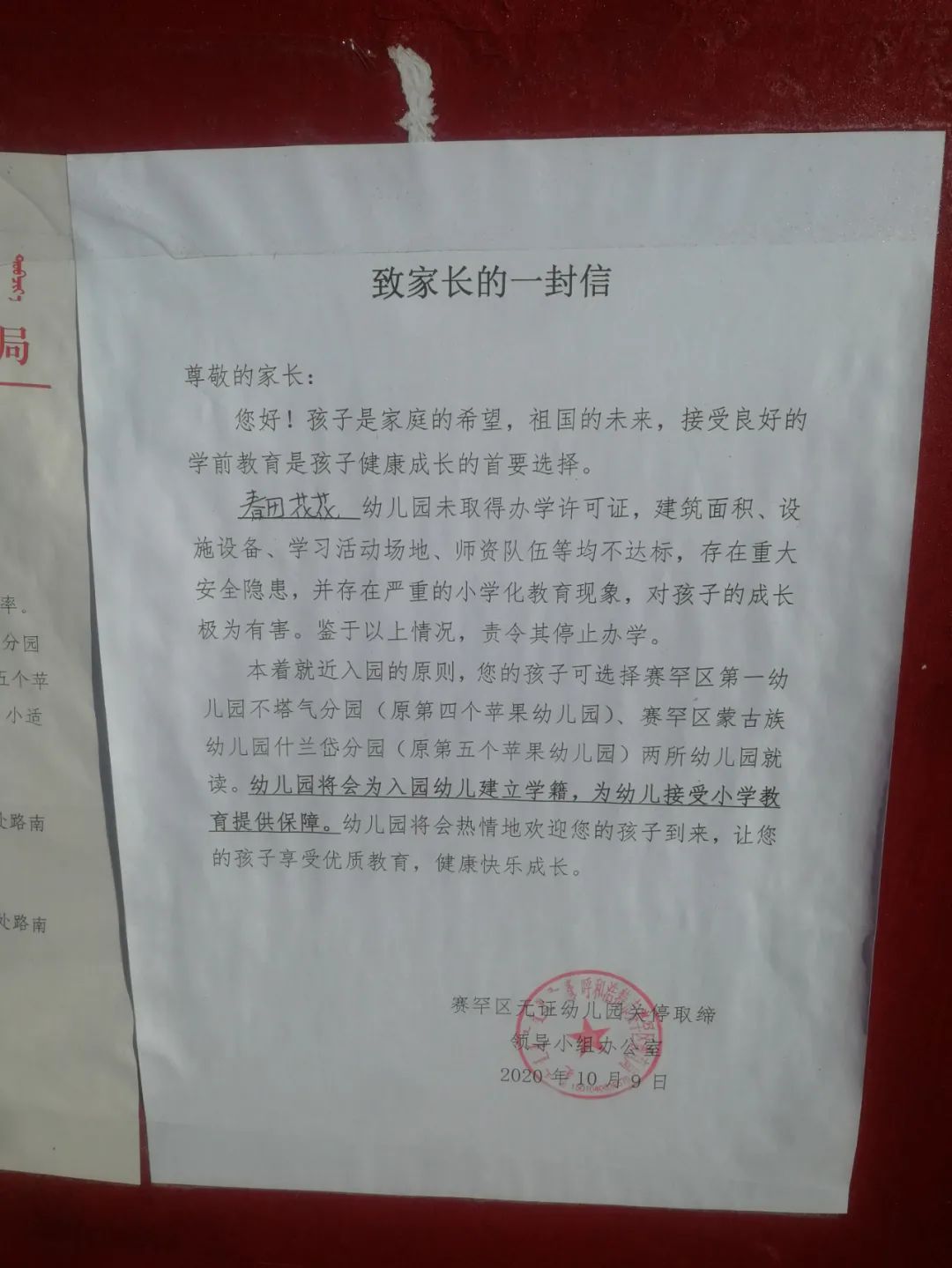 在2020年10月9日赛罕区无证幼儿园关停取缔领导小组办公室发布的《致家长一封信》中,晨报融媒记者了解到,春天花花幼儿园未取得办学许可证,建筑面积、师资队伍等均不达标,存在重大安全隐患,责令其停止办学。这封信的落款处盖有呼和浩特市赛罕区教育局的公章。