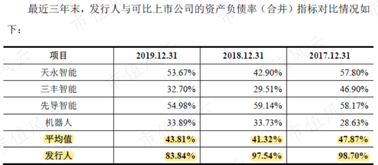 在豪森股份选择的天永智能、三丰智能、先导智能、机器人四家同行业上市公司中,其资产负债率可以说是“一骑绝尘,遥遥领先”:83.84%的资产负债率,比最高的53.67%还要高出不少。
