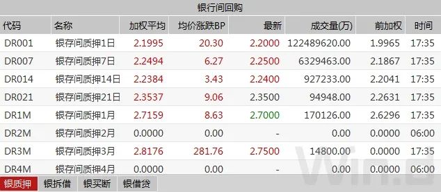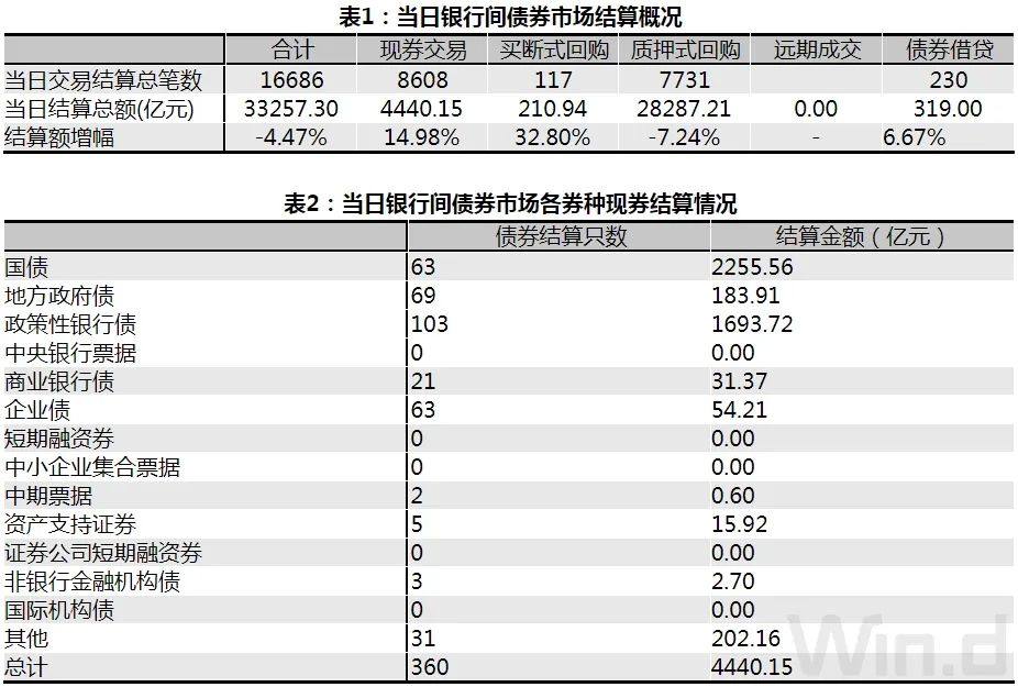 10月19日,全国银行间债券市场结算总量为33257.30亿元,较上日下降4.47%,交易结算总笔数为16686笔。其中,质押式回购28287.21亿元,买断式回购210.94亿元,现券交易4440.15亿元,债券借贷319.00亿元。银行间债券市场回购利率整体上行,其中,3天回购利率上行36.4bp至2.395%。
