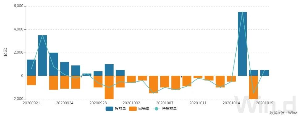 央行公告称,为维护银行体系流动性合理充裕,10月19日以利率招标方式开展了500亿元7天期逆回购操作,中标利率2.20%。Wind数据显示,当日无逆回购到期,有800亿元国库现金定存到期,因此,央行公开市场全口径净回笼300亿元。
