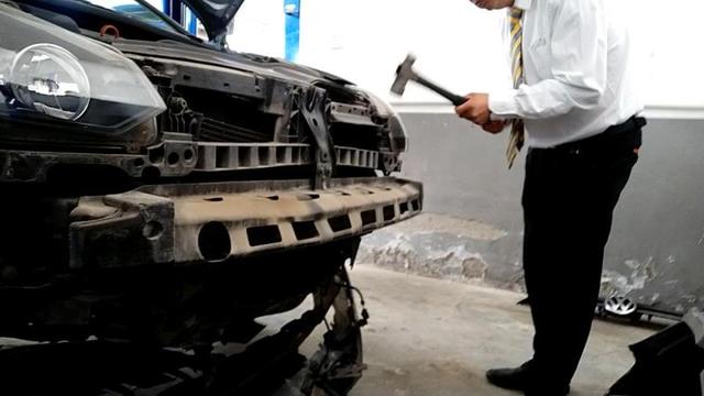 据《新京报》的报道称,一辆在事故中受损的大众轿车,被送到上汽大众北京恒星天诚4S店维修车间,负责维修该车的维修技师却在车辆进行拆解定损前,抡起一把铁锤砸向车辆的水箱框架,也就是临近撞车部位。