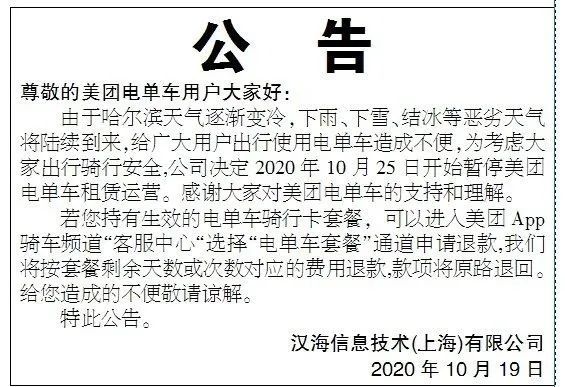 据哈尔滨市城管局相关负责人介绍,已经敦促各大共享单车企业提前做好告知和相关善后工作,确保市民在各类共享单车App内的充值、月卡等权益不受任何损害。