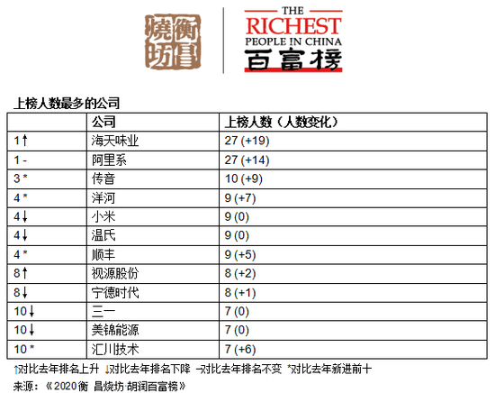 榜单显示,海天味业和阿里系均有27位股东上榜。其中,海天味业因上市公司市值攀升,上榜人数增加了19位;阿里系因蚂蚁集团即将上市,增加14位新的股东达到门槛。传音也有10位股东上榜。