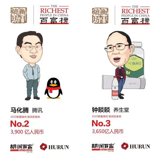 榜单显示,56岁的马云财富增长1250亿元,以4000亿元第四次成为中国首富;49岁的马化腾财富增长1300亿元,以3900亿元位列第二;66岁的钟睒睒因旗下两家新上市公司财富迅速增长,首次上榜便以3650亿元位列第三。