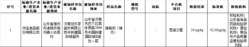 (三)山东省济南佳乐家超市有限公司中铁建国际城超市销售的、来自山东省潍坊市诸城市华宝食品股份有限公司的猪前肘(猪肉),经山东省食品药品检验研究院检验发现,其中恩诺沙星不符合食品安全国家标准规定。