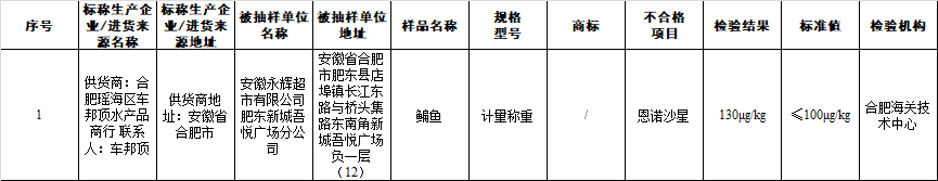(四)安徽永辉超市有限公司肥东新城吾悦广场分公司销售的、来自安徽省合肥瑶海区车邦顶水产品商行的鳊鱼,恩诺沙星不符合食品安全国家标准规定。检验机构为合肥海关技术中心。