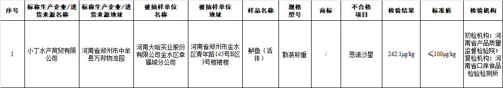 (二)河南大哈实业股份有限公司金水区幸福城分公司销售的、来自河南省郑州市小丁水产商贸有限公司的鲈鱼(活体),经河南省产品质量监督检验院检验发现,其中恩诺沙星不符合食品安全国家标准规定。