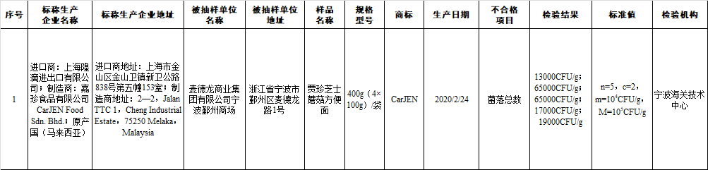 (二)浙江省麦德龙商业集团有限公司宁波鄞州商场销售的、标称上海隍滴进出口有限公司进口的、嘉珍食品有限公司生产的贾珍芝士蘑菇方便面(原产国:马来西亚),菌落总数不符合食品安全国家标准规定。检验机构为宁波海关技术中心。