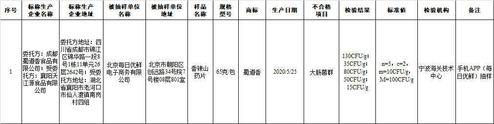 (一)北京每日优鲜电子商务有限公司在每日优鲜(手机APP)销售的、标称四川省成都蜀道香食品有限公司委托湖北省襄阳沃江源食品有限公司生产的香辣山药片,大肠菌群不符合食品安全国家标准规定。检验机构为宁波海关技术中心。