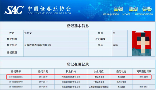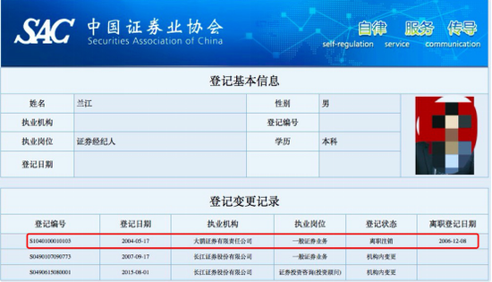 张伟文和兰江分别于2004年3月和5月在中证协登记为大鹏证券员工。两年之后的2006年,大鹏证券接到清算通知,随后便进入破产程序,而其经纪业务也由长江证券接管。2007年9月17日,两人在中证协登记信息,执业机构更改为长江证券。