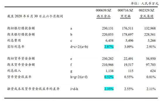 据问询函显示,西王食品的借款利率为2.87%、存款的收益率为0.52%,融资成本与存款收益率相差2.35%,也就表明其多付出了不少的资金成本。