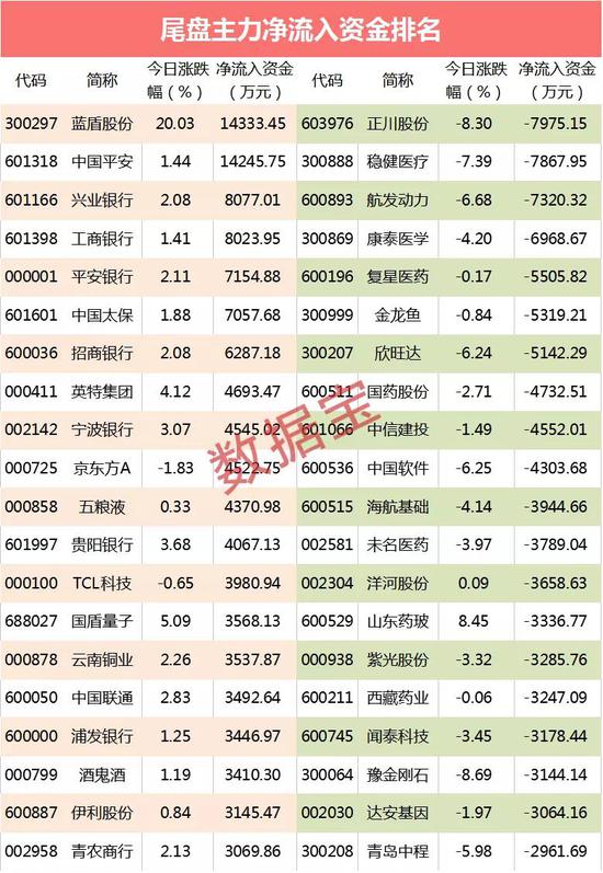 尾盘主力资金净流出19.7亿元,其中创业板流出12.37亿元,沪深300流入6.75亿元。尾盘有8个行业资金流入,银行以6.67亿元流入居首,非银金融、食品饮料分别流入超亿元。医药生物尾盘流出超6亿元,国防军工流出超3亿元,电子、电气设备、化工、机械设备等流出超2亿元。
