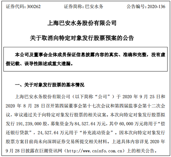 只不过,巴安水务的这次“卖身”尝试失败了。