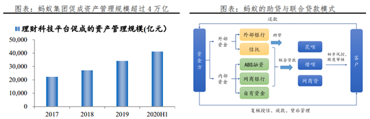互联网信贷方面,蚂蚁积极探索助贷和联合贷款模式,98%贷款由金融机构提供。截至 2020年6月蚂蚁集团共2.1万亿信贷规模,其中98%的资金来自合作银行和发行ABS, 自营贷款余额仅占1.68%;