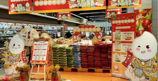 而在全国各门店,永辉则以“天赐粮机抢头鲜”为核心宣传点,基于田趣粮仓主题的“谷堆”、“米筐”、“麦穗”等经典元素进行了视觉化创意迭代,在保持品牌故事连贯性的同时,将田趣大米产地的风俗特色,渗透进线下店内营销活动的场景升级中。