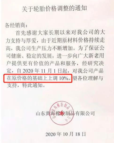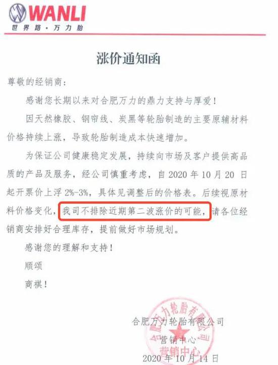 例如,万力轮胎10月14日发出涨价通知函,决定从10月20日起开票价上调2%-3%,并不排除第二波涨价的可能。涨价原因为:天然橡胶、炭黑等原辅材料价格上涨,轮胎制造成本增加。