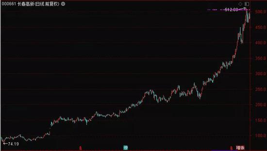 在这个收购股份的刺激下,今年8月份,长春高新最高达到了513元(前复权),涨幅十分可观。