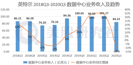 10月22日美股盘后,英特尔公布了2020财年第三季度的业绩报告。财报显示,英特尔本季度营收为183.3亿美元,同比下降4%,稍高于7月的市场预期;净利润为42.8亿美元,同比下降28.6%;核心业务数据中心营收为84.22亿美元,同比下降10%。