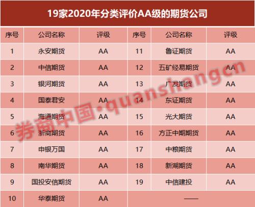 今年获评期货公司分类评价最高评级(AA级)的公司共有19家,分别为永安期货、中信期货、银河期货、国泰君安(港股02611)期货、海通期货等。