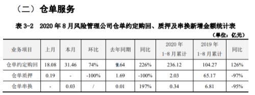 其中,风险管理子公司的仓单约定购回业务,增长更为惊人!8月份同比增长226%,达到了31.46亿元。而今年前8个月,累计达到了236.12亿元,同比增长126%。