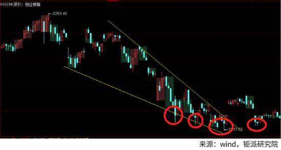图为2020年3月创业板指数小时级别K线图。中线下跌末期,每一波恐慌性下跌位置已经相差无几。在这些区间,如果有好的行业是值得及时配置的。这里需要提醒投资者的是,弱市不要追高,否则旷日持久。(重要的事情说三遍)