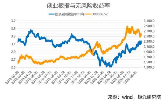 从实操的角度来看,通常我们认为10年国债到期收益率3.5%是一条红线。2019年4月底5月初到达3.5%,随后创业板指下杀,因此这是到达顶部的信号之一。