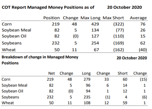 鉴于基本面推高,管制资金基金头寸本周大幅增加。玉米头寸涨幅最大,净多头增加了 48 份合约。尽管玉米的净多头头寸总体上没有接近创纪录水平,但多头对空头头寸的比率现在超过 80%,表明对基金的看涨观点清晰可见。大豆的这一比例目前为 99%。